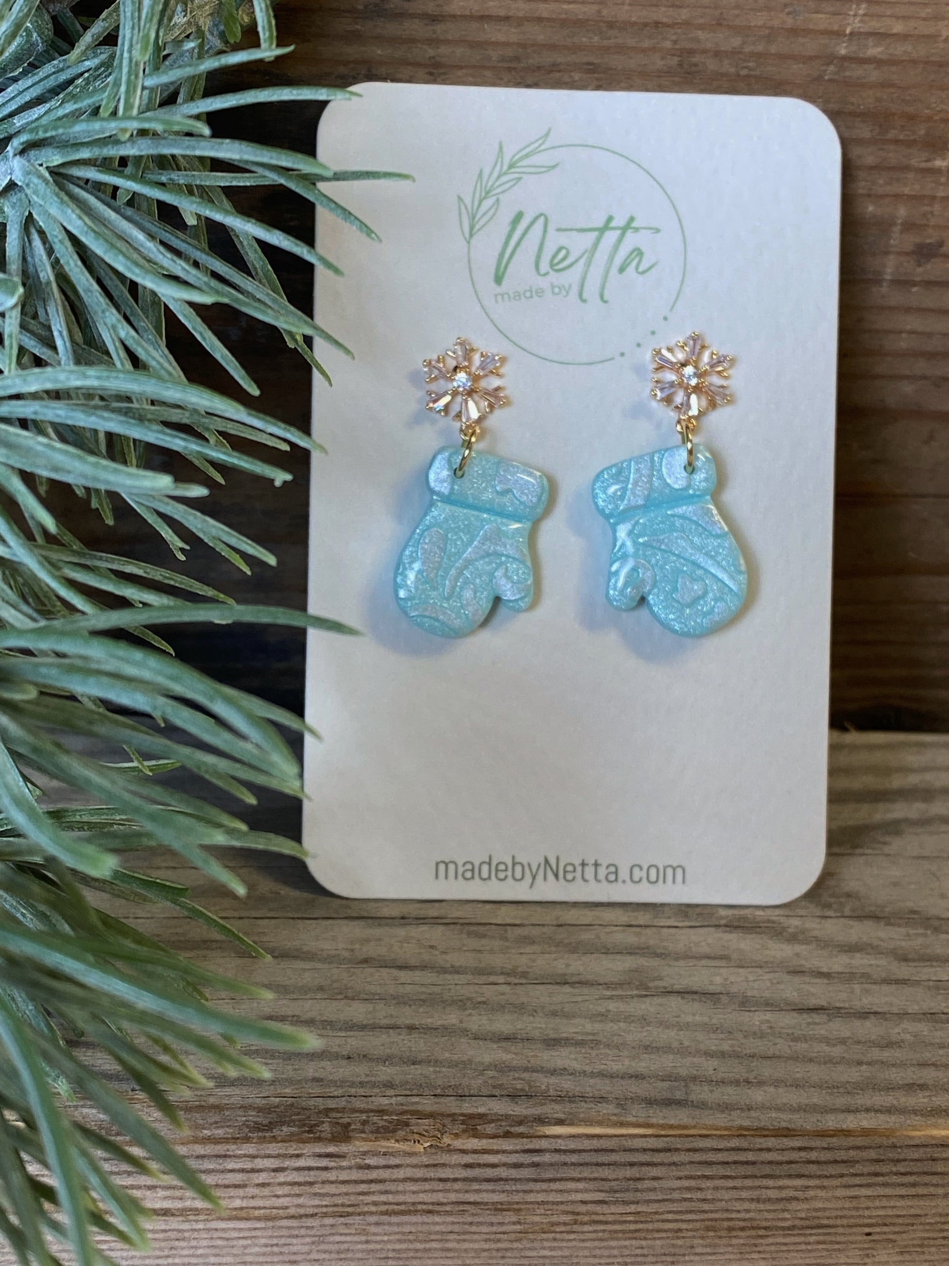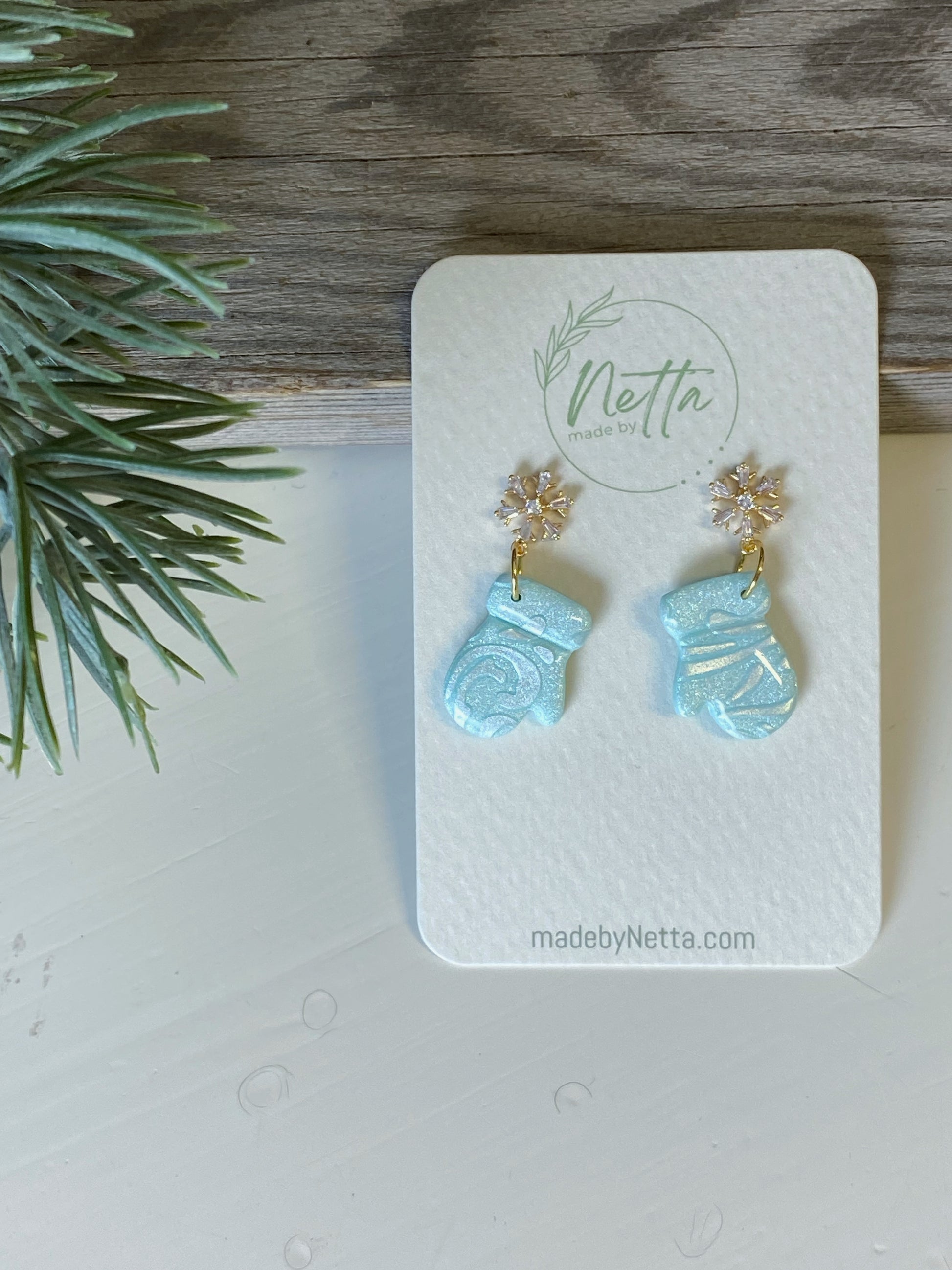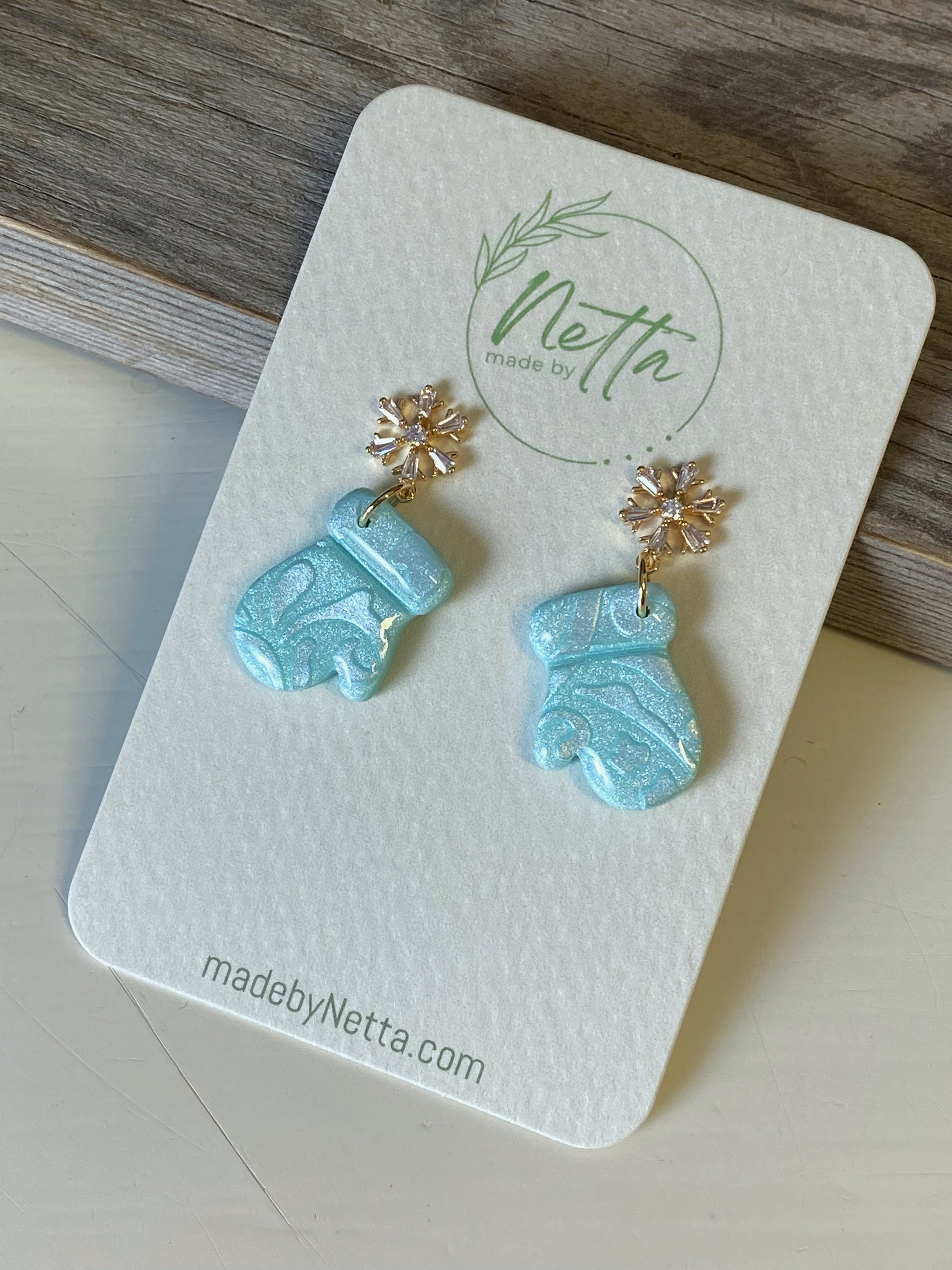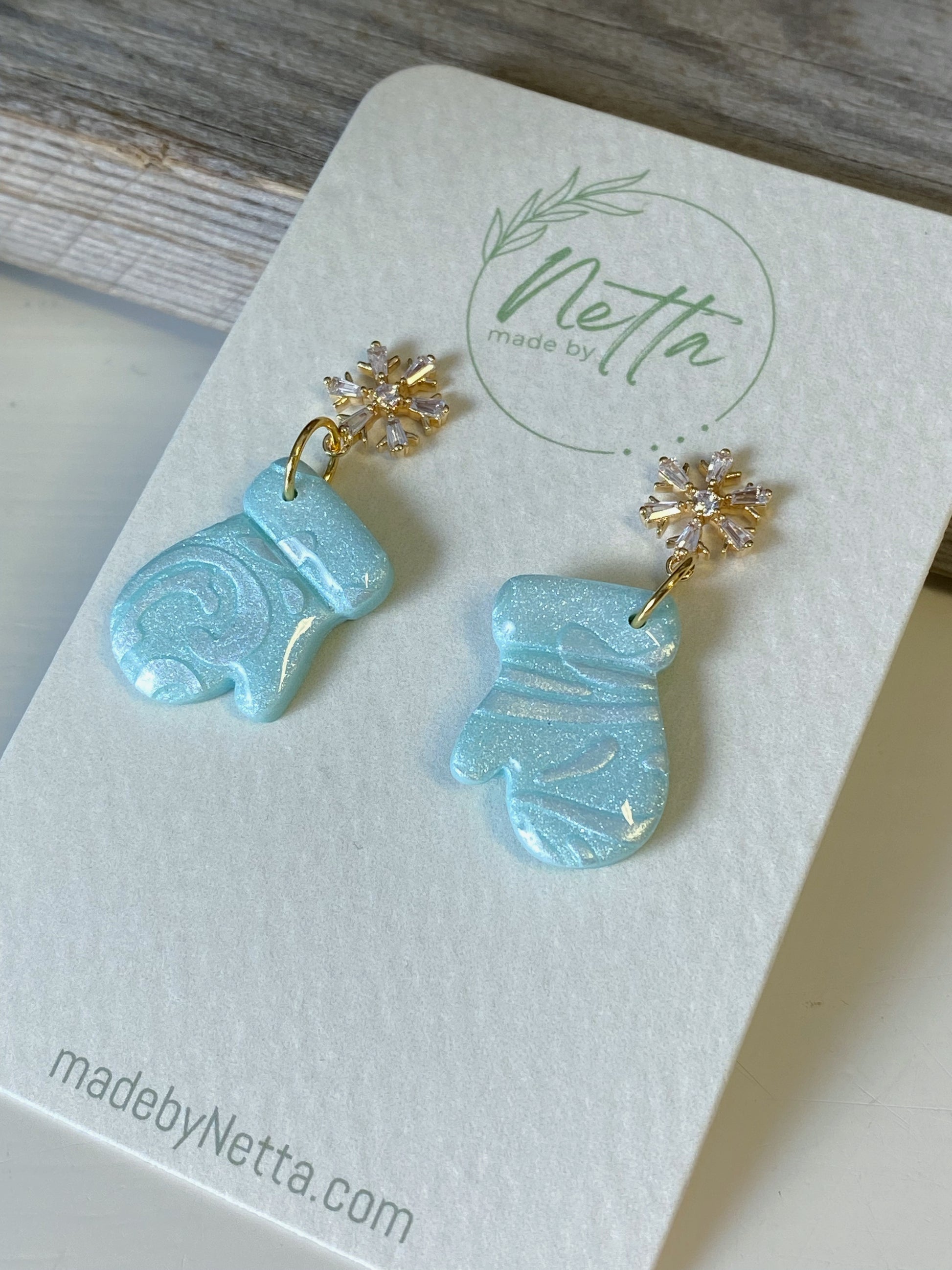 Blå votter med glitrende mønster laget med micapudder. Henger fra zircoinabelagte snøkrystaller.