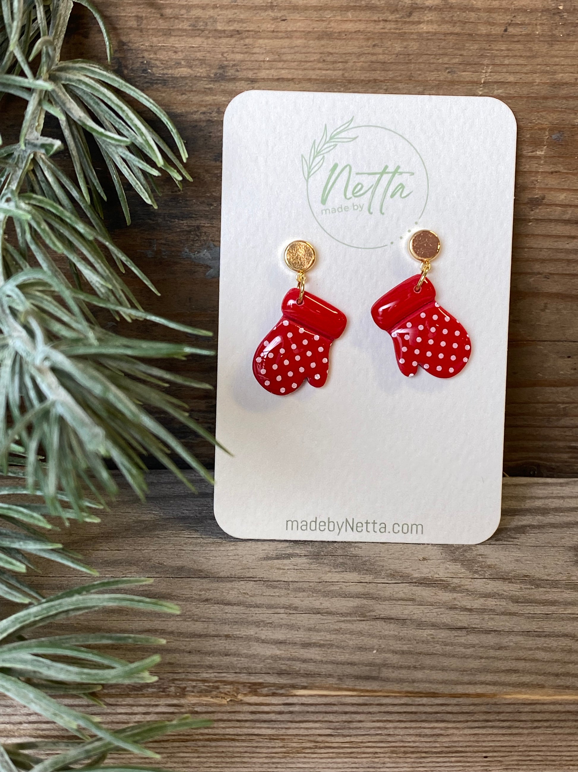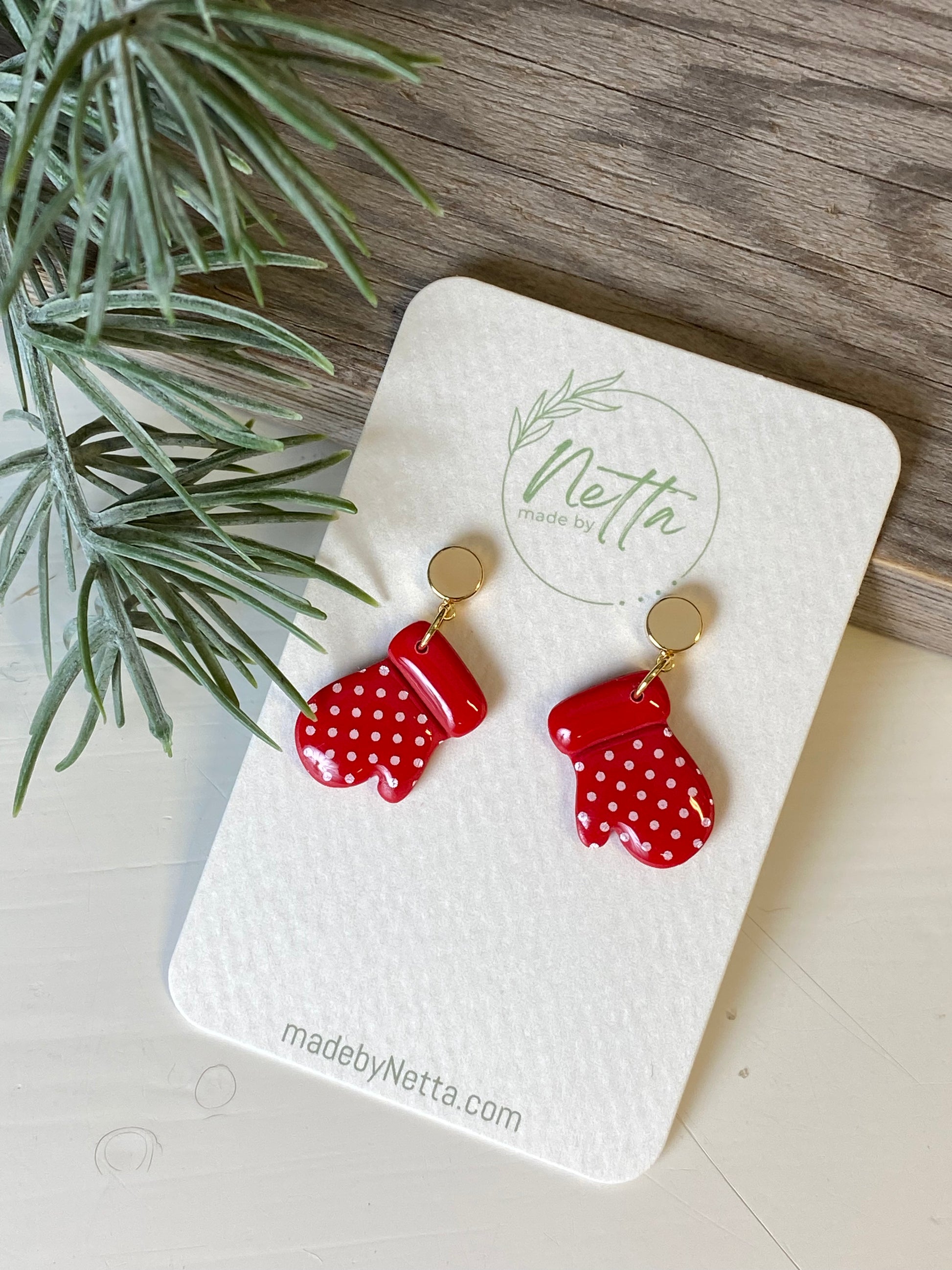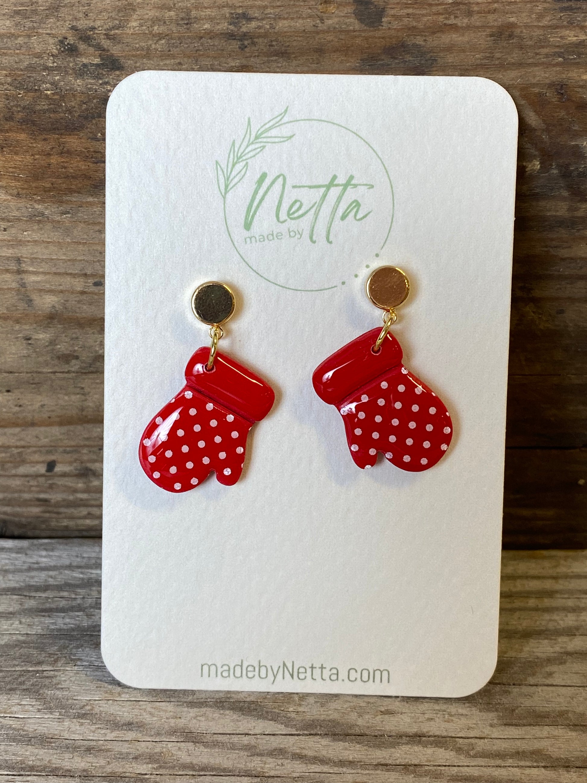 Røde votter med hvite små prikker. Henger fra enkle innstikk med nål i gullbelagt sterling sølv.