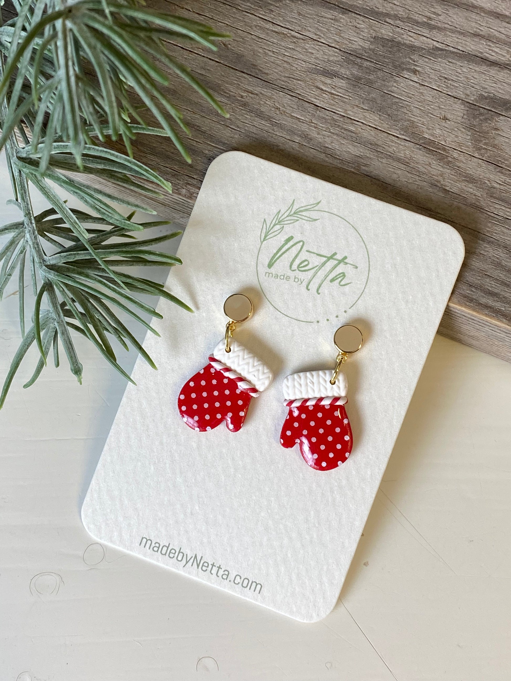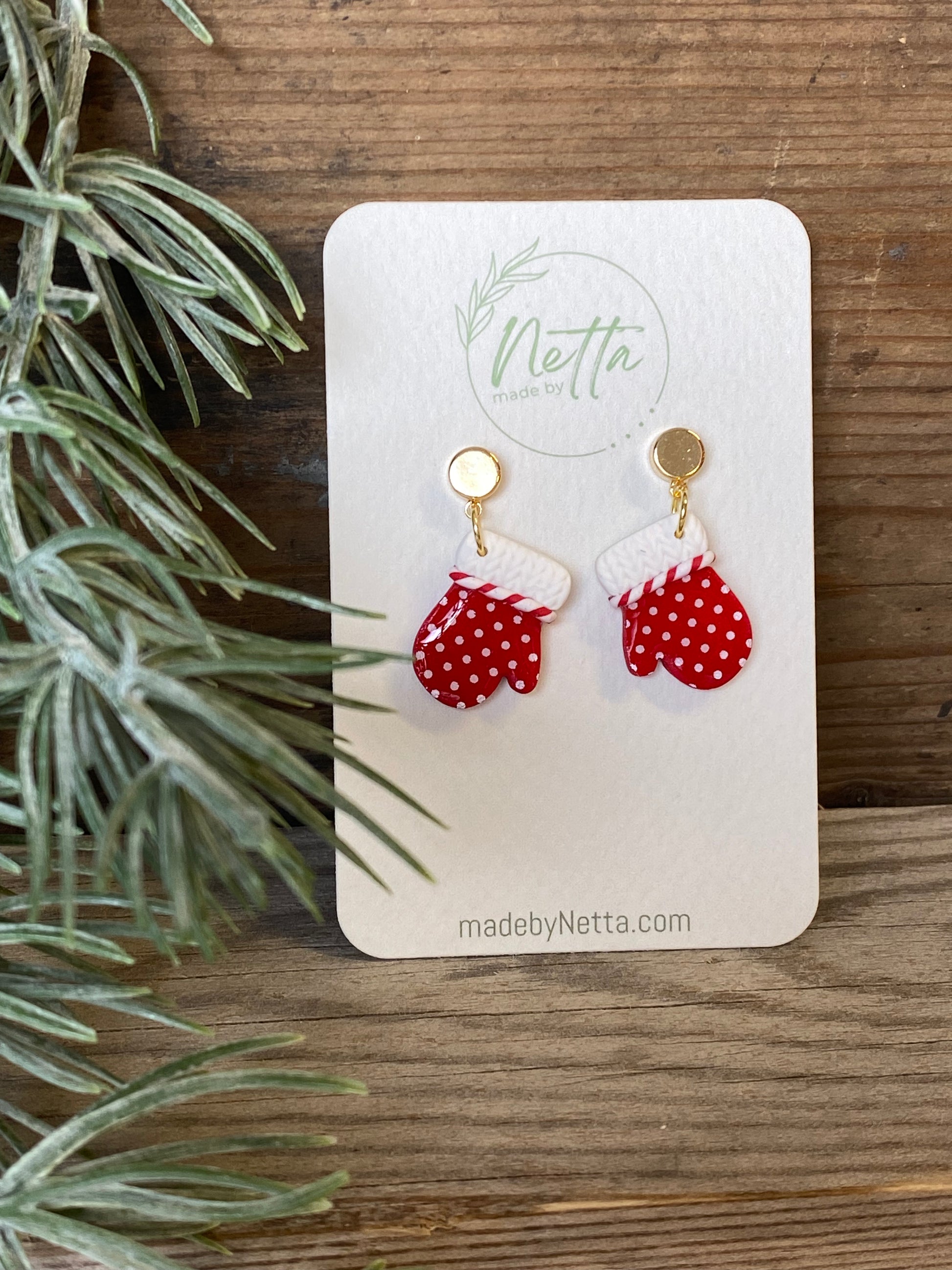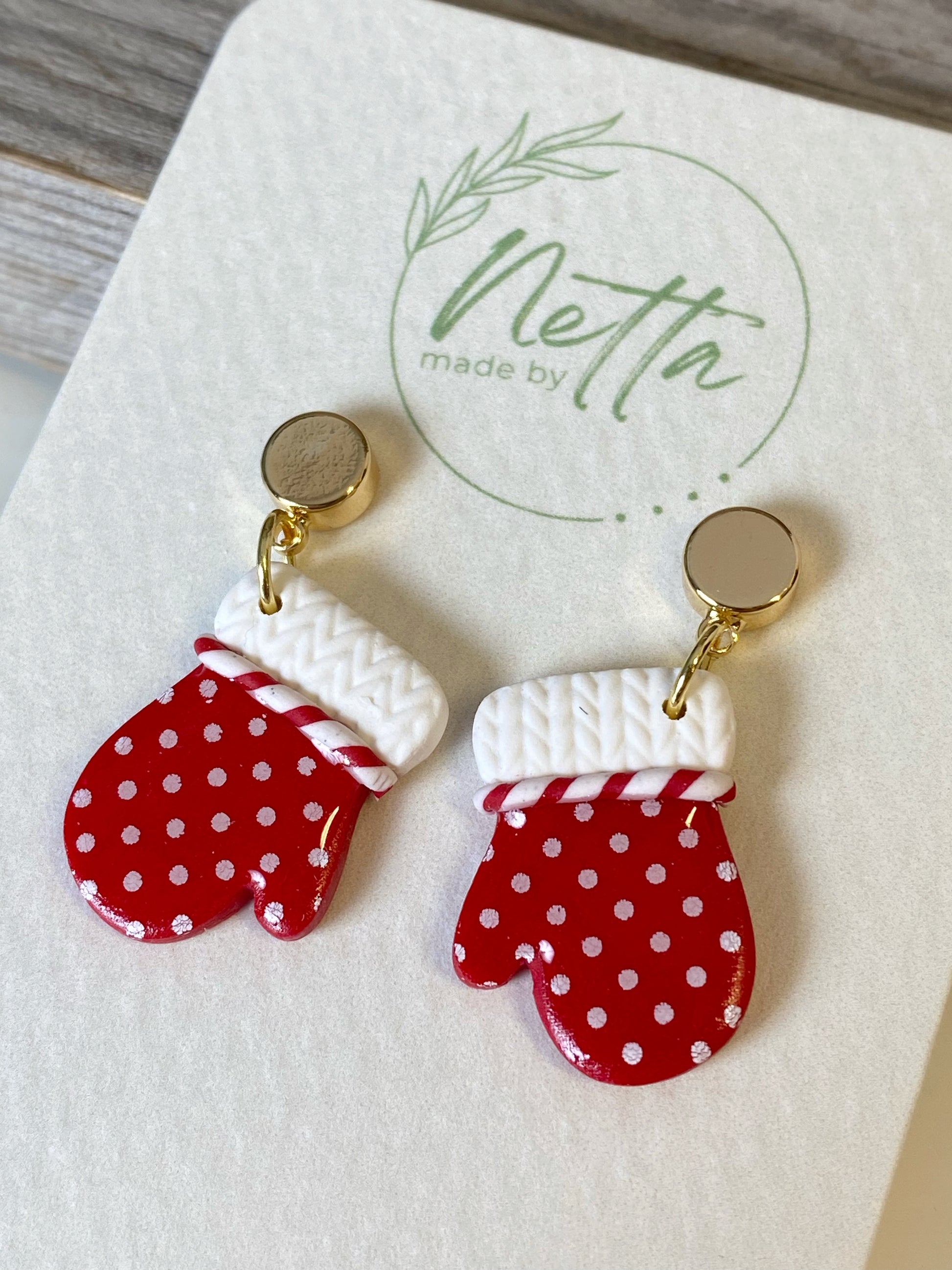 Røde votter med hvite små prikker, og hvit mansjett. Henger fra enkle innstikk med nål i gullbelagt sterling sølv.