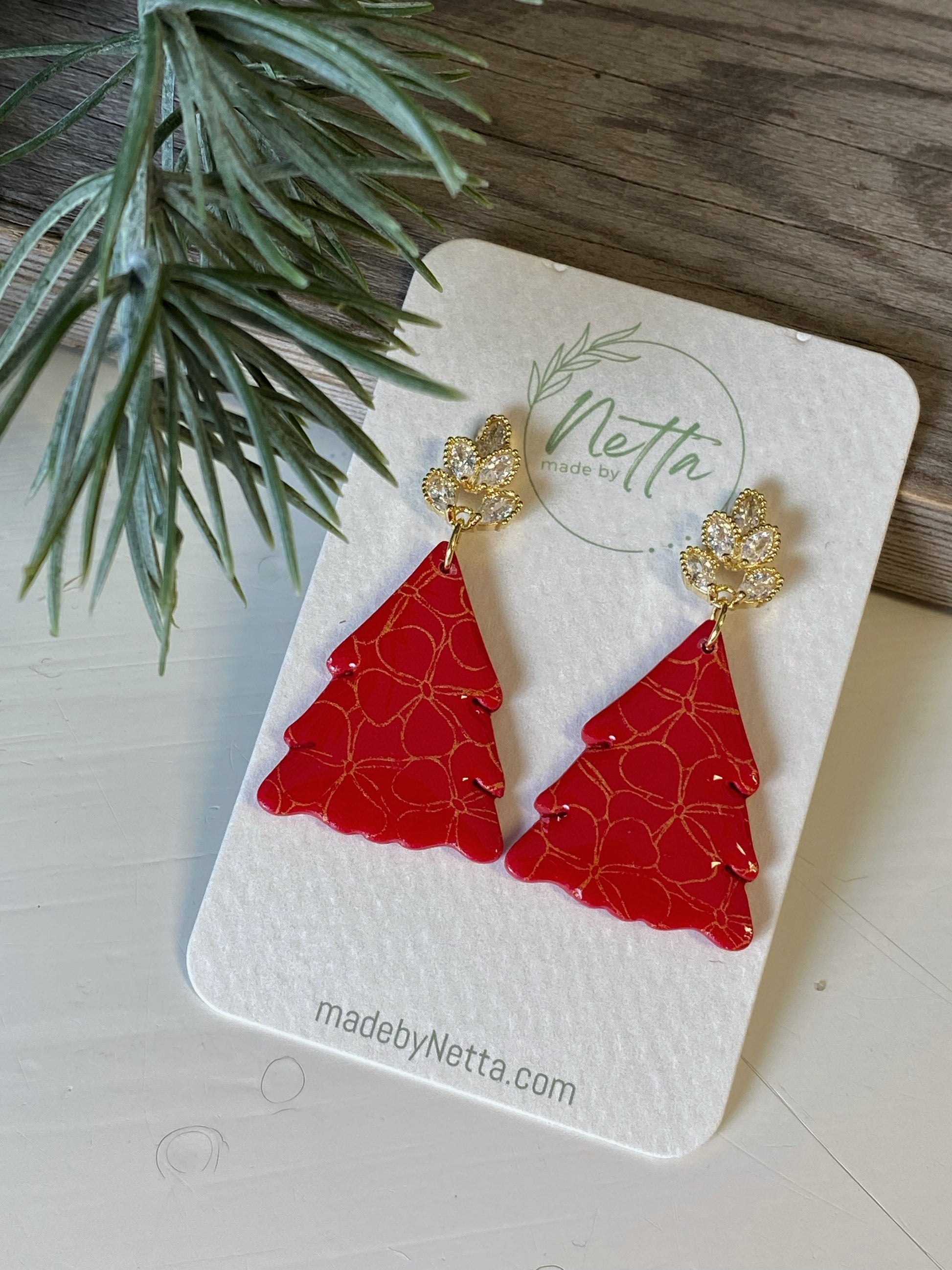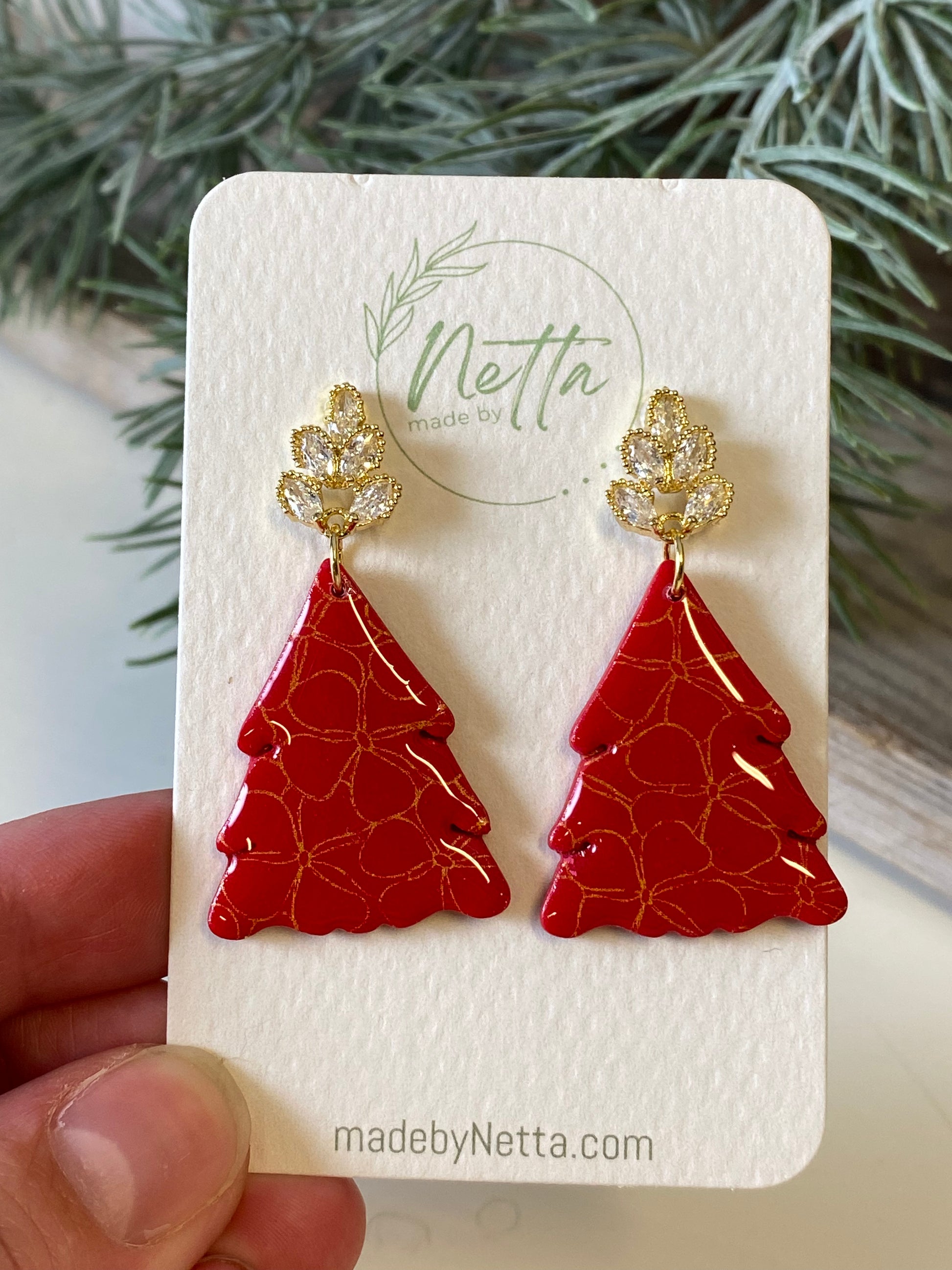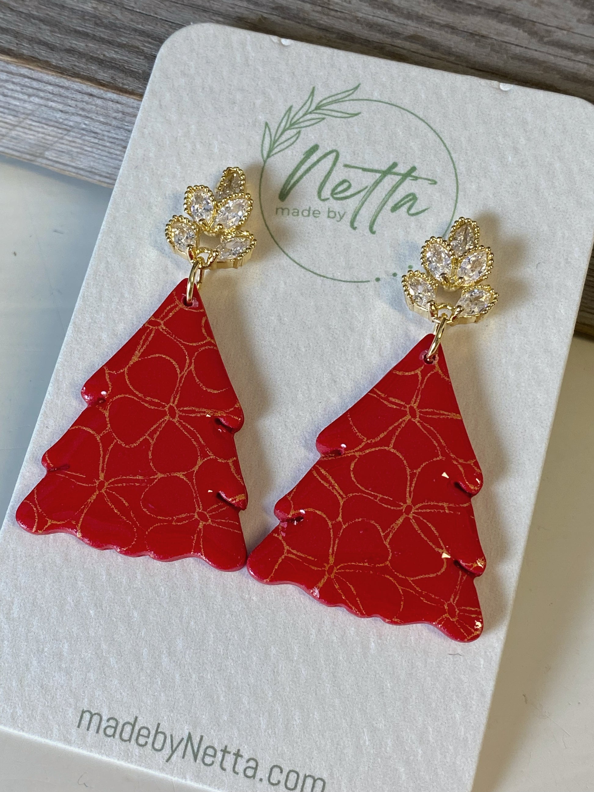 Røde juletrær med gullfarget silketrykk. Henger fra vakre zircoinakrystaller formet som blader.